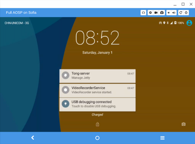 上图中的 Full AOSP on Sofia 就是行车记录仪设备,点击 Vysor 上的 View 按钮会自动通过 ADB 在设备上安装 Vysor 受控端 App,稍等片刻就可以看到记录仪的 Android 系统主界面咯:
